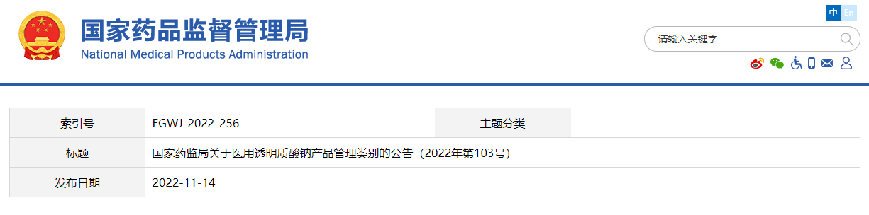 九、本公告自發(fā)布之日起實施,《關(guān)于醫(yī)用透明質(zhì)酸鈉產(chǎn)品管理類別的公告》(原國家食品藥品監(jiān)督管理局公告2009年第81號)同時廢止。