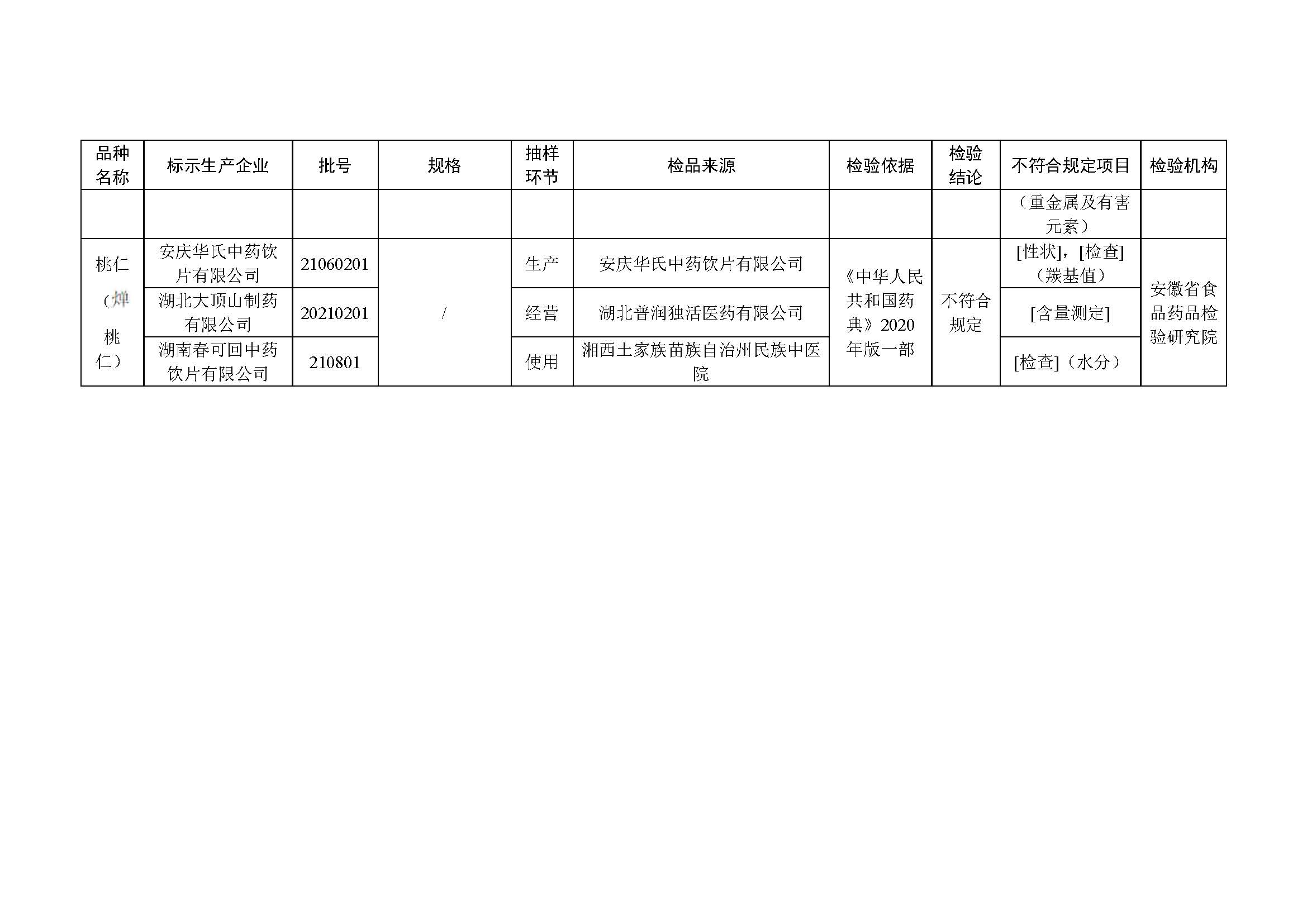 經(jīng)安徽省食品藥品檢驗研究院檢驗,標(biāo)示為安慶華氏中藥飲片有限公司、湖北大頂山制藥有限公司、湖南春可回中藥飲片有限公司生產(chǎn)的3批次桃仁(