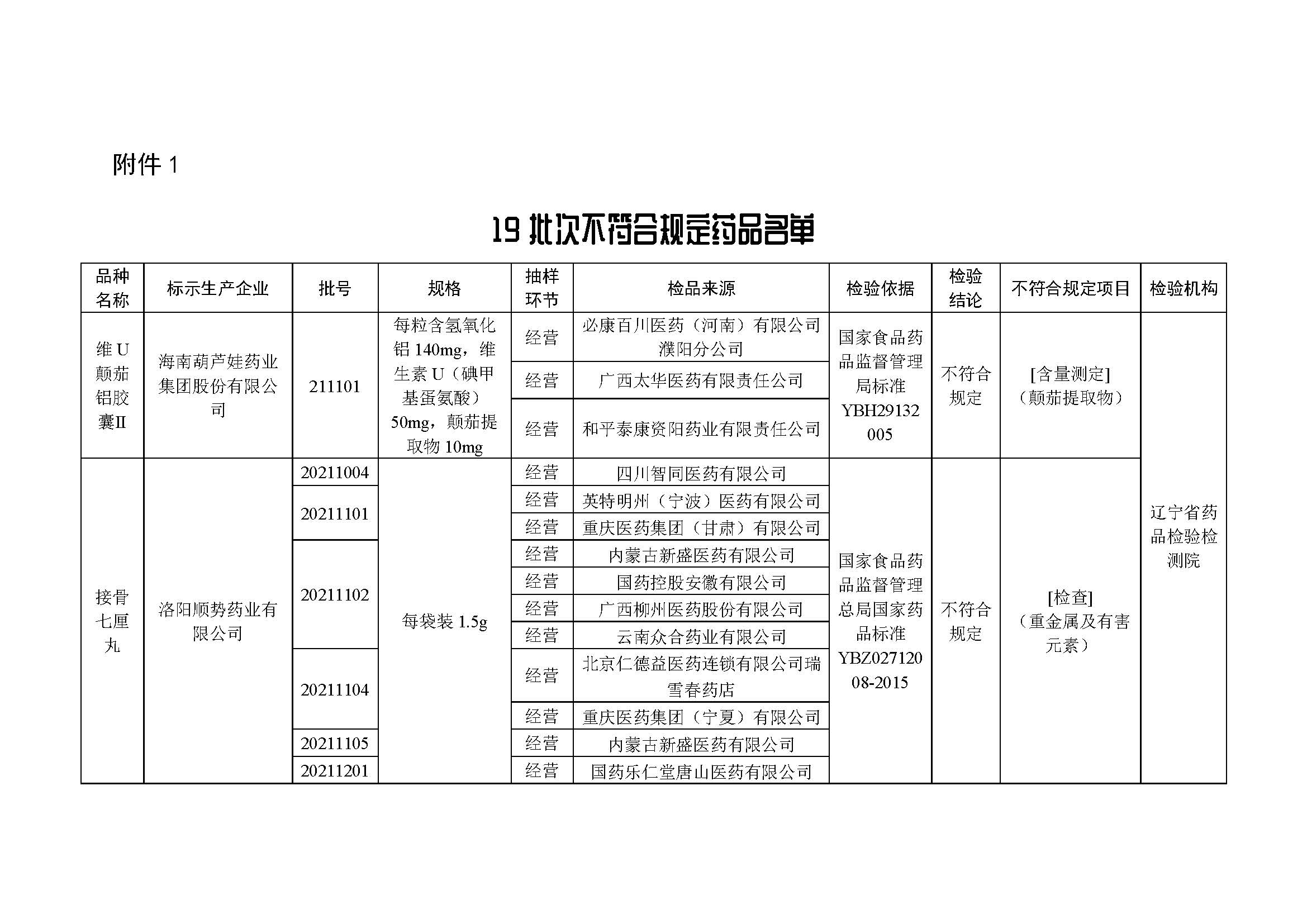經(jīng)遼寧省藥品檢驗檢測院等3家藥品檢驗機構(gòu)檢驗,標(biāo)示為洛陽順勢藥業(yè)有限公司等12家企業(yè)生產(chǎn)的接骨七厘丸等19批次藥品不符合規(guī)定。現(xiàn)將相關(guān)情況通告如下: