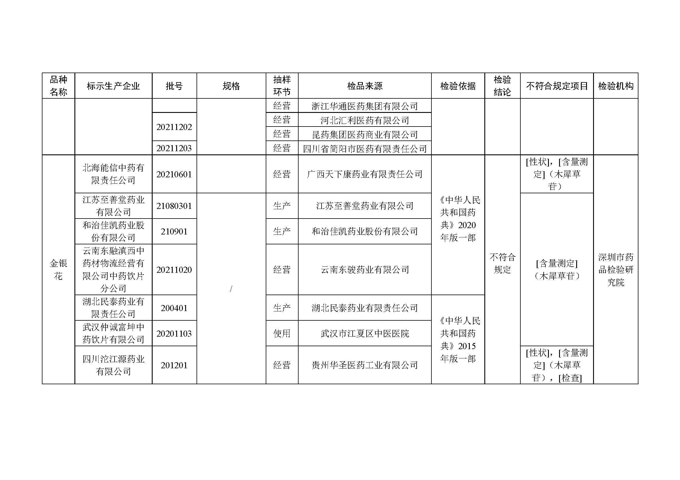 經(jīng)深圳市藥品檢驗研究院檢驗,標(biāo)示為江蘇至善堂藥業(yè)有限公司、和治佳凱藥業(yè)股份有限公司、湖北民泰藥業(yè)有限責(zé)任公司、武漢仲誠富坤中藥飲片有限公司、北海能信中藥有限責(zé)任公司、四川沱江源藥業(yè)有限公司、云南東融滇西中藥材物流經(jīng)營有限公司中藥飲片分公司生產(chǎn)的7批次金銀花不符合規(guī)定,不符合規(guī)定項目包括含量測定、性狀、重金屬及有害元素。