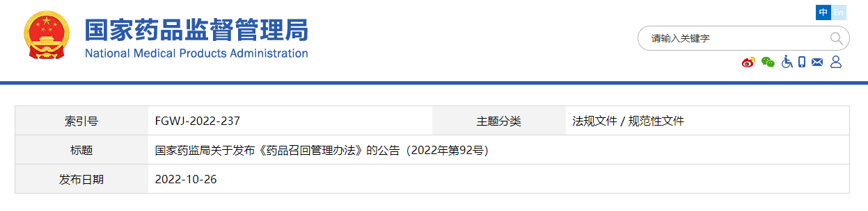 為貫徹落實(shí)《中華人民共和國(guó)藥品管理法》《中華人民共和國(guó)疫苗管理法》等法律法規(guī)要求,國(guó)家藥監(jiān)局組織修訂了《藥品召回管理辦法》,現(xiàn)予發(fā)布,自2022年11月1日起施行。