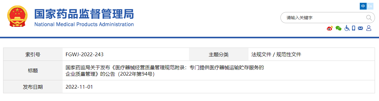 為加強醫(yī)療器械經(jīng)營監(jiān)督管理,規(guī)范專門提供醫(yī)療器械運輸貯存服務(wù)的企業(yè)質(zhì)量管理,根據(jù)《醫(yī)療器械監(jiān)督管理條例》(國務(wù)院令739號)及《醫(yī)療器械經(jīng)營監(jiān)督管理辦法》(國家市場監(jiān)督管理總局令第54號),國家藥品監(jiān)督管理局組織制定了《醫(yī)療器械經(jīng)營質(zhì)量管理規(guī)范附錄:專門提供醫(yī)療器械運輸貯存服務(wù)的企業(yè)質(zhì)量管理》,現(xiàn)予以發(fā)布,自2023年1月1日起施行。