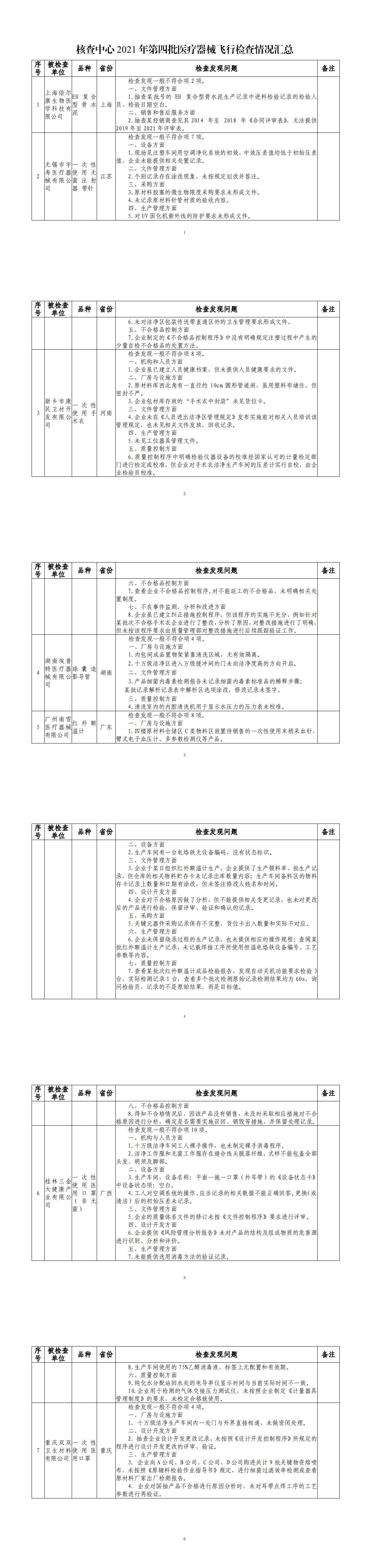 為加強(qiáng)醫(yī)療器械監(jiān)督管理,保障醫(yī)療器械安全有效,依據(jù)《醫(yī)療器械監(jiān)督管理?xiàng)l例》《醫(yī)療器械生產(chǎn)監(jiān)督管理辦法》《藥品醫(yī)療器械飛行檢查辦法》《醫(yī)療器械生產(chǎn)質(zhì)量管理規(guī)范》及相關(guān)附錄,以及《食品藥品監(jiān)管總局關(guān)于印發(fā)醫(yī)療器械生產(chǎn)質(zhì)量管理規(guī)范現(xiàn)場檢查指導(dǎo)原則等4個(gè)指導(dǎo)原則的通知》(食藥監(jiān)械監(jiān)〔2015〕218號(hào))等要求,按照國家藥品監(jiān)督管理局2021年醫(yī)療器械檢查工作部署,核查中心于2021年10月-12月組織開展了醫(yī)療器械生產(chǎn)企業(yè)飛行檢查工作,發(fā)現(xiàn)上海倍爾康生物醫(yī)學(xué)科技有限公司等7家企業(yè)存在一般項(xiàng)目不符合《醫(yī)療器械生產(chǎn)質(zhì)量管理規(guī)范》及相關(guān)附錄要求。具體情況見附件。