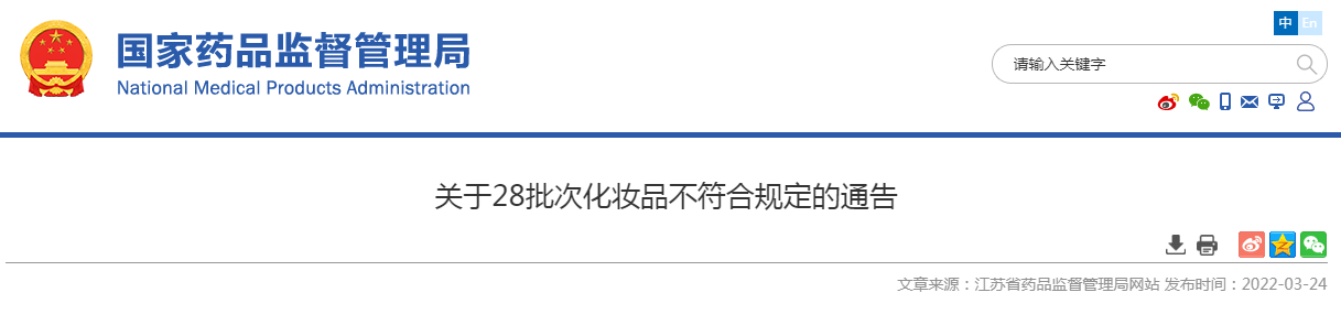 依據(jù)年度抽檢工作計劃,江蘇省藥品監(jiān)督管理局組織對部分化妝品生產(chǎn)、經(jīng)營單位進(jìn)行了抽檢,現(xiàn)將抽檢中發(fā)現(xiàn)的28批次不符合規(guī)定的化妝品信息予以通告(詳見附件)。
