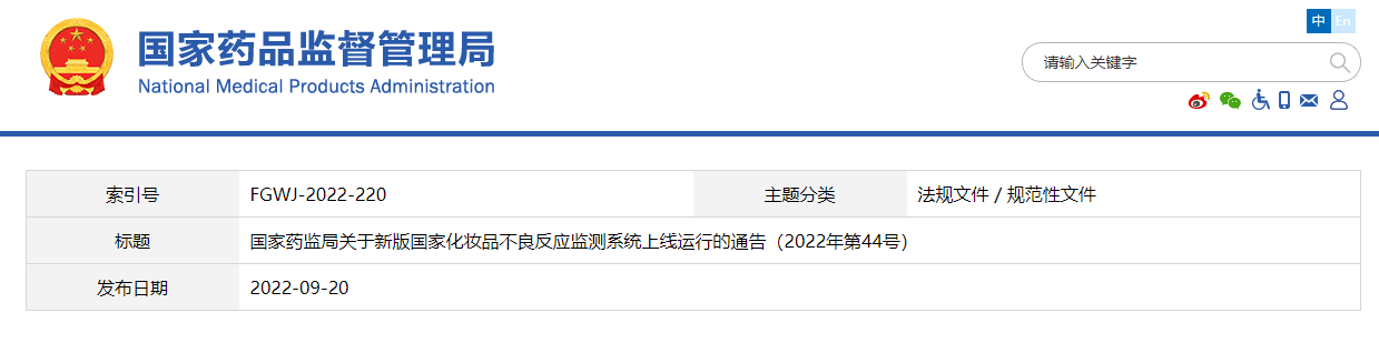 為貫徹執(zhí)行《化妝品監(jiān)督管理?xiàng)l例》《化妝品生產(chǎn)經(jīng)營監(jiān)督管理辦法》《化妝品不良反應(yīng)監(jiān)測(cè)管理辦法》,加強(qiáng)化妝品不良反應(yīng)監(jiān)測(cè)工作,提高化妝品不良反應(yīng)報(bào)告、分析、評(píng)價(jià)工作效率,國家藥監(jiān)局組織對(duì)國家化妝品不良反應(yīng)監(jiān)測(cè)系統(tǒng)進(jìn)行升級(jí)完善,新版系統(tǒng)將于2022年10月1日起上線運(yùn)行,F(xiàn)將有關(guān)事項(xiàng)通告如下: